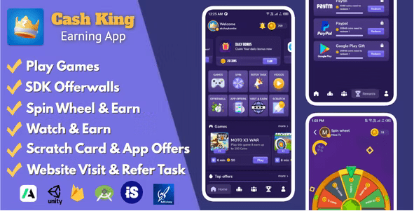 Cash King is a Android earning application with Admin Panel Back-end system that comes with App Source code for Free. There are many option available for earn cash. Like, user can earn cash via Play Games, Scratch card, complete task challenges & Offerwalls. Also earn with Watch Video, Complete offer, Spin wheel, Website visit, Refer Task and Daily Bonus rewards. This application is build with Android Studio and we used clean and quality code for best performance with Unique UI Design that attracts Most users and already integrated with Ad Networks.